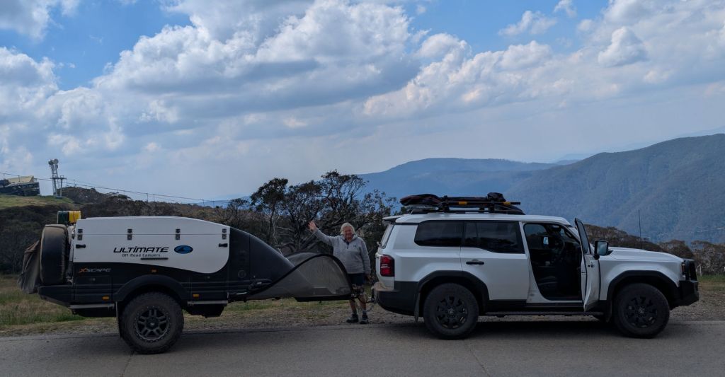 We made it back down by 1.25pm (it was not a 45 minute one way walk at all), set up Starlink and Lance attended his meeting. By 2.30 we were heading back down Mt Stirling Rd. Lance had never seen Mt Buller so instead of heading straight to Melbourne and arrive at our friend’s house at a reasonable hour, we drove up 13% gradient road with its multiple hairpin bends, trailerin tow. It was worth the drive, and being a little late for Sue. We will definitely go back and ski there one day. It looks an amazing skifield and that’s coming from rusted on Thredbo snobs.