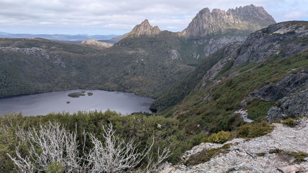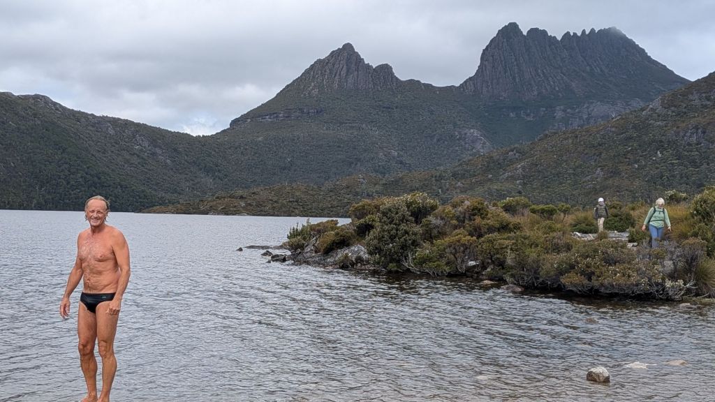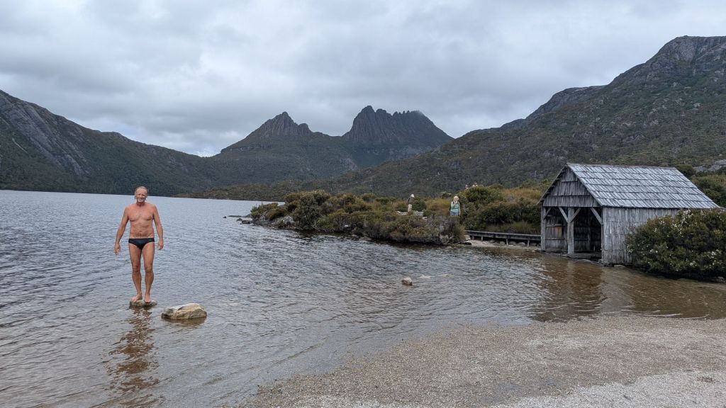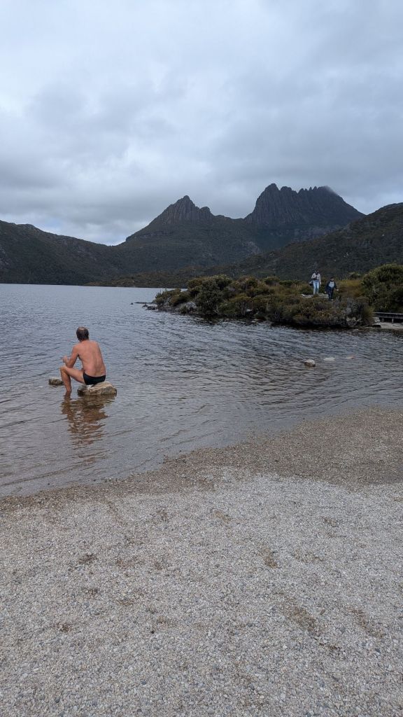 Our last full day in Tasmania entailed a nice little 10km hike up to Marion’s Lookout at Cradle Mountain. We first visited Dove Lake where we saw people on an organised swim. It’s a 5km swim around the perimeter of the lake. They all had wetsuits but of course Lance couldn’t let an opportunity go by and swam in his Speedos. It was 14 degrees which is the same as Manly in winter (and Drummoyne pool in October).