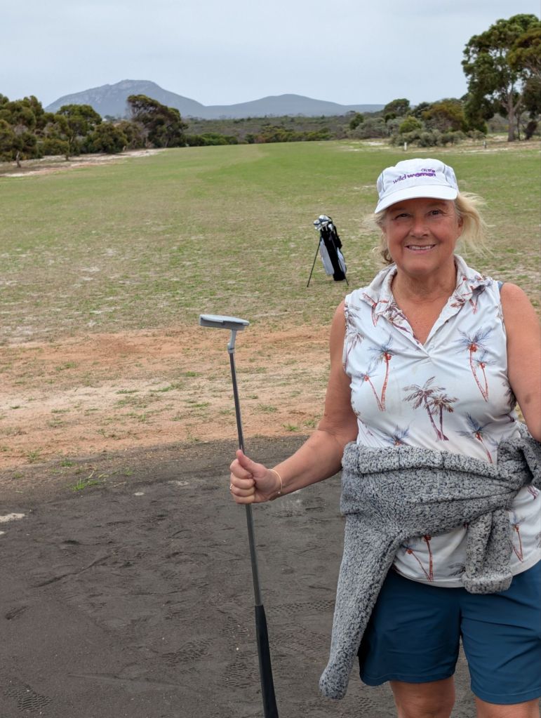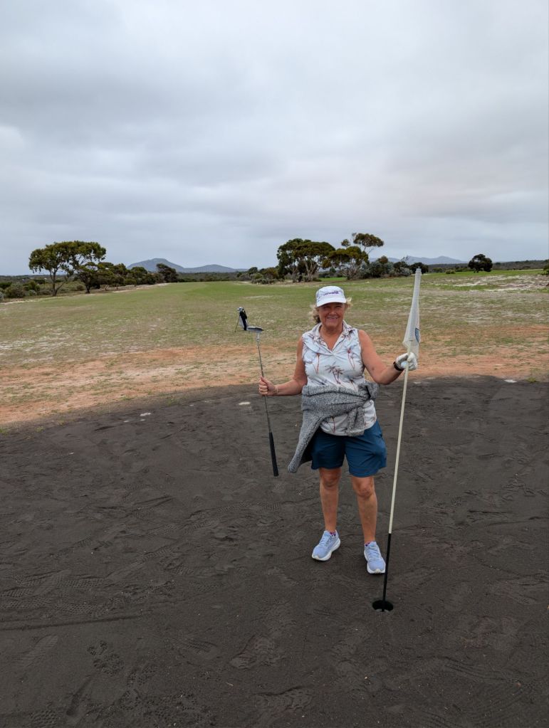 I was on a promise of a golf game before we left for Bremer Bay which was 3 hours away. But first we had to wash the car and van, fill the tanks and talk to Michelle. We finally started the game at 12.30. Hopetoun golf course was the first real course we had played at for a while. We played 9 holes which took quite a while due to the multiple shots required by me to complete each hole.